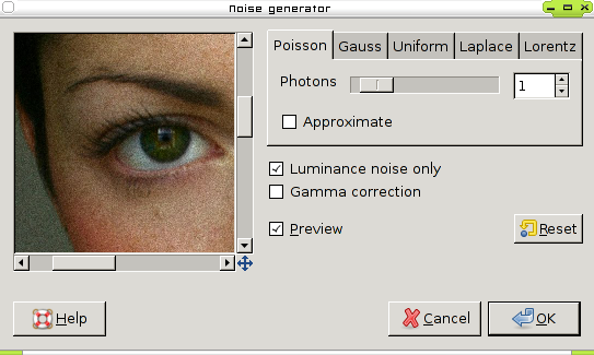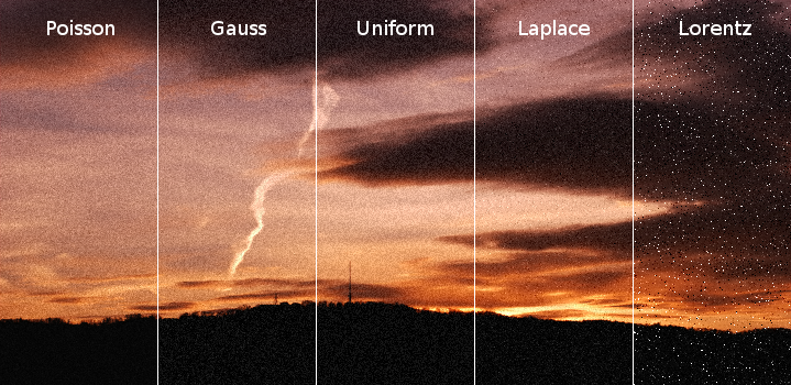 For all noise types together you can select whether a gamma correction should be applied on the image such that noise is applied to linear image data. After noise application the image is retransformed to sRGB. You can also select whether or not you want to have luminance noise only and for that the image is transformed to the YCbCr colour space before adding noise.