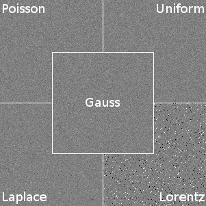 In the images below the noise variance is the same for all noise types at a brightness of neutral gray (128) except for Lorentz noise where the variance is not defined.