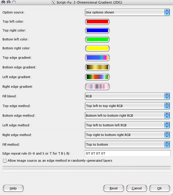 Version 1.0. Developed from Four-Corner Gradient and Gradient-to-Gradient scripts-fu. If you find 2DG has too many options, you might try one of these other scripts-fu instead.