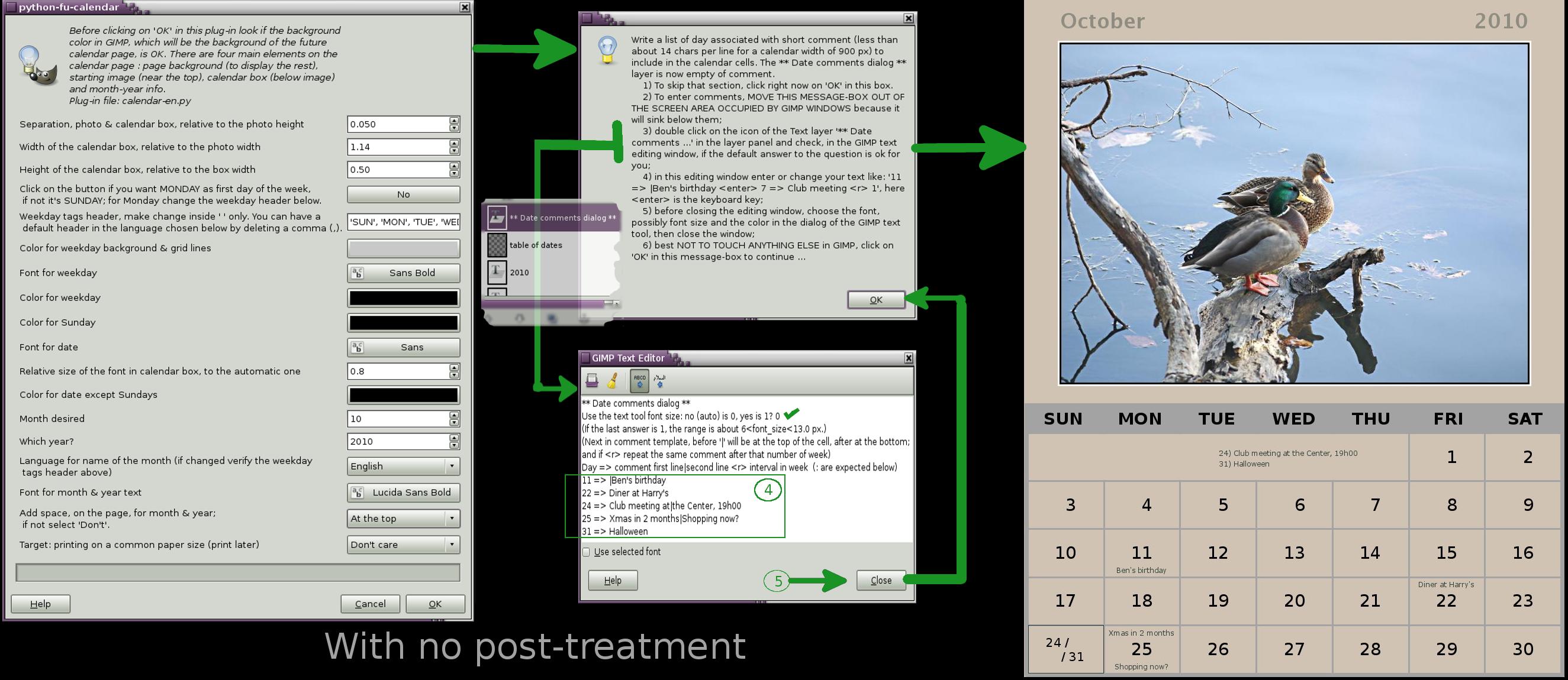 Update on Jul. 18 2010 version 0.2 : there is now another option that appears during the execution of the plug-in. It is the possibility of help in adding short personal (or not) comment to the user specified dates. The 'example_cale10_10v2.jpg' file give a specimen of the result with a diagram of the steps. The other files is the plug-in and a language translation file. There is also some small tweaks to the rest from the previous version.